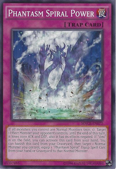 If all monsters you control are Normal Monsters (min. 1): Target 1 Effect Monster your opponent controls; until the end of this turn, it loses 1000 ATK and DEF, also it has its effects negated. If ‘Umi’ is on the field, you can activate this card from your hand. You can banish this card from your Graveyard, then target 1 Normal Monster you control; equip 1 ‘Phantasm Spiral’ Equip Spell Card from your hand or Graveyard to that Normal Monster.