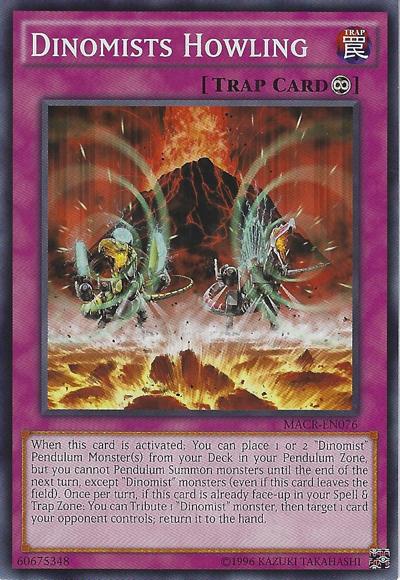 When this card is activated: You can place 1 or 2 ‘Dinomist’ Pendulum Monster(s) from your Deck in your Pendulum Zone, but you cannot Pendulum Summon monsters until the end of the next turn, except ‘Dinomist’ monsters (even if this card leaves the field). Once per turn, if this card is already face-up in your Spell & Trap Zone: You can Tribute 1 ‘Dinomist’ monster, then target 1 card your opponent controls; return it to the hand.