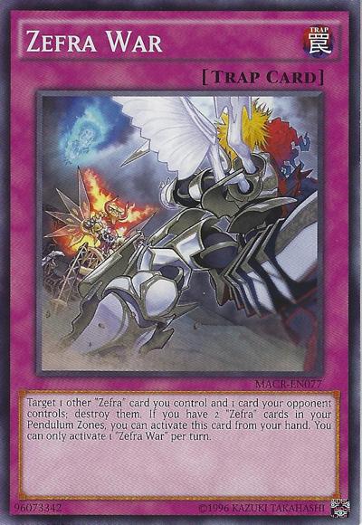Target 1 other ‘Zefra’ card you control and 1 card your opponent controls; destroy them. If you have 2 ‘Zefra’ cards in your Pendulum Zones, you can activate this card from your hand. You can only activate 1 ‘Zefra War’ per turn.