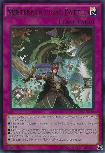 Activate 1 of these effects, also, after that, Set this card face-down instead of sending it to the GY.● Change 1 Set ‘Subterror’ monster on the field to face-up Attack or Defense Position.● Change 1 face-up ‘Subterror’ monster on the field to face-down Defense Position.● ATK/DEF of 1 ‘Subterror’ monster on the field become equal to its combined original ATK/DEF until the end of this turn.● This turn, activated effects of ‘Subterror’ cards cannot be negated.
