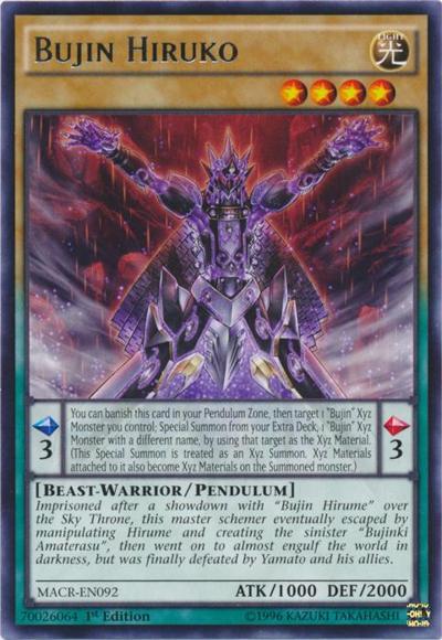 Pendulum EffectYou can banish this card in your Pendulum Zone, then target 1 ‘Bujin’ Xyz Monster you control; Special Summon from your Extra Deck, 1 ‘Bujin’ Xyz Monster with a different name, by using that target as the Xyz Material. (This Special Summon is treated as an Xyz Summon. Xyz Materials attached to it also become Xyz Materials on the Summoned monster.)Monster EffectImprisoned after a showdown with ‘Bujin Hirume’ over the Sky Throne, this master schemer eventually escaped by manipulating Hirume and creating the sinister ‘Bujinki Amaterasu’, then went on to almost engulf the world in darkness, but was finally defeated by Yamato and his allies.