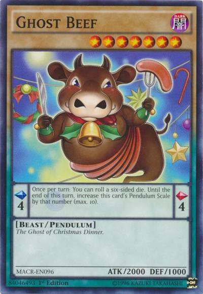 Pendulum EffectOnce per turn: You can roll a six-sided die. Until the end of this turn, increase this card’s Pendulum Scale by that number (max. 10).Monster EffectThe Ghost of Christmas Dinner.