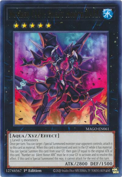 3 Level 5 monstersOnce per turn: You can target 1 Special Summoned monster your opponent controls; attach it to this card as a face-up Xyz Material. When this card is destroyed and sent to the Graveyard while it has Xyz Material: You can Special Summon this card from your Graveyard, then gain LP equal to the original ATK of this card. ‘Number 101: Silent Honor ARK’ must be in your Graveyard to activate and to resolve this effect. If this card is Special Summoned this way, it cannot attack for the rest of this turn.