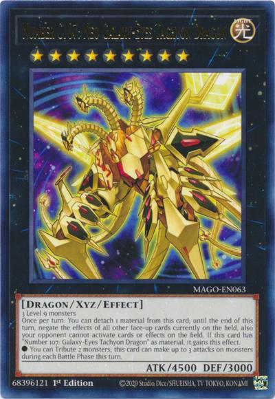 3 Level 9 monstersOnce per turn: You can detach 1 Xyz Material from this card; until the end of this turn, negate the effects of all other face-up cards currently on the field, also your opponent cannot activate cards or effects on the field. If this card has ‘Number 107: Galaxy-Eyes Tachyon Dragon’ as an Xyz Material, it gains this effect.● You can Tribute 2 monsters; this card can make up to 3 attacks on monsters during each Battle Phase this turn.