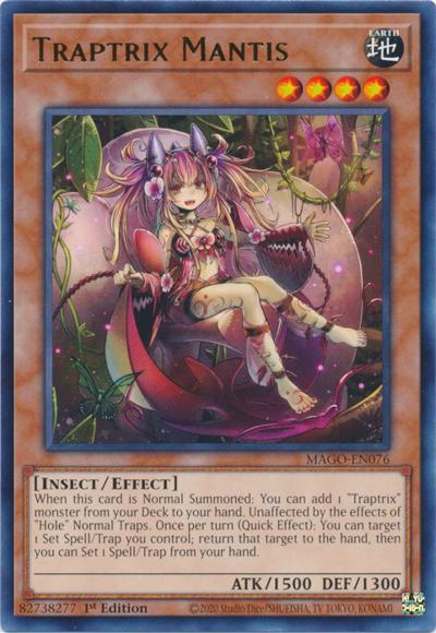When this card is Normal Summoned: You can add 1 ‘Traptrix’ monster from your Deck to your hand. Unaffected by the effects of ‘Hole’ Normal Traps. Once per turn (Quick Effect): You can target 1 Set Spell/Trap you control; return that target to the hand, then you can Set 1 Spell/Trap from your hand.
