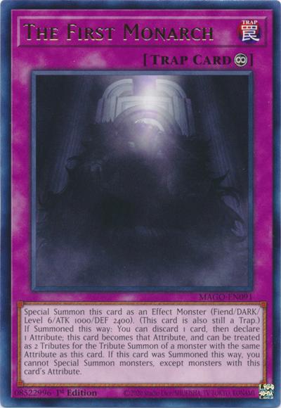 Special Summon this card as an Effect Monster (Fiend-Type/DARK/Level 6/ATK 1000/DEF 2400). (This card is also still a Trap Card.) If Summoned this way: You can discard 1 card, then declare 1 Attribute; this card becomes that Attribute, and can be treated as 2 Tributes for the Tribute Summon of a monster with the same Attribute as this card. If this card was Summoned this way, you cannot Special Summon monsters, except monsters with this card’s Attribute.