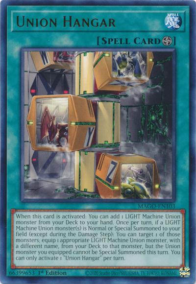 When this card is activated: You can add 1 LIGHT Machine Union monster from your Deck to your hand. Once per turn, if a LIGHT Machine Union monster(s) is Normal or Special Summoned to your field (except during the Damage Step): You can target 1 of those monsters; equip 1 appropriate LIGHT Machine Union monster, with a different name, from your Deck to that monster, but the Union monster you equipped cannot be Special Summoned this turn. You can only activate 1 ‘Union Hangar’ per turn.