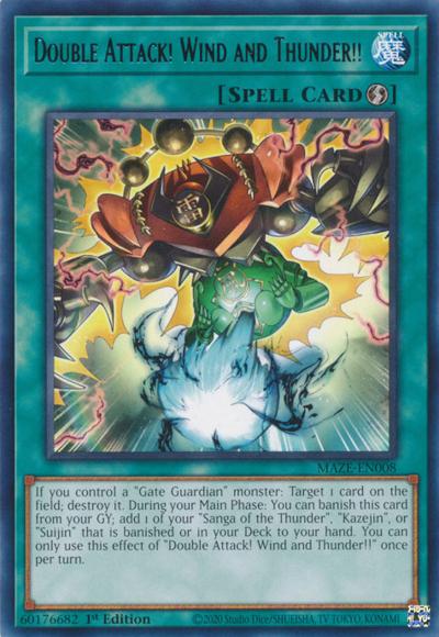 If you control a ‘Gate Guardian’ monster: Target 1 card on the field; destroy it. During your Main Phase: You can banish this card from your GY; add 1 of your ‘Sanga of the Thunder’, ‘Kazejin’, or ‘Suijin’ that is banished or in your Deck to your hand. You can only use this effect of ‘Double Attack! Wind and Thunder!!’ once per turn.