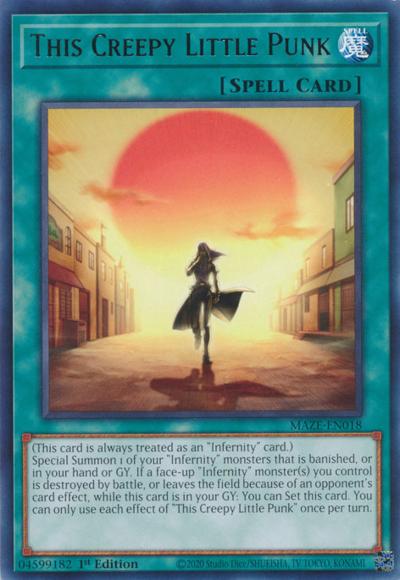 (This card is always treated as an ‘Infernity’ card.) . Special Summon 1 of your ‘Infernity’ monsters that is banished, or in your hand or GY. If a face-up ‘Infernity’ monster(s) you control is destroyed by battle, or leaves the field because of an opponent’s card effect, while this card is in your GY: You can Set this card. You can only use each effect of ‘This Creepy Little Punk’ once per turn.