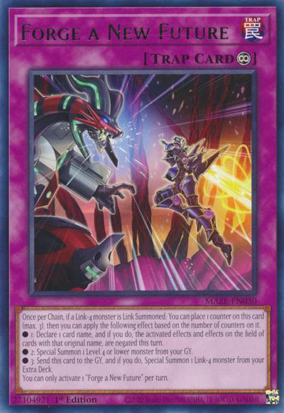Once per Chain, if a Link-4 monster is Link Summoned: You can place 1 counter on this card (max. 3), then you can apply the following effect based on the number of counters on it.. ●1: Declare 1 card name, and if you do, the activated effects and effects on the field of cards with that original name, are negated this turn. . ●2: Special Summon 1 Level 4 or lower monster from your GY. . ●3: Send this card to the GY, and if you do, Special Summon 1 Link-4 monster from your Extra Deck. . You can only activate 1 ‘Forge a New Future’ per turn.