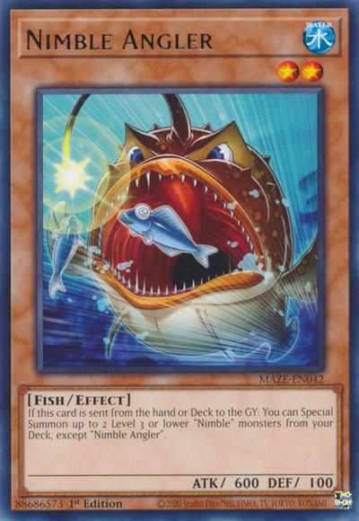 If this card is sent from the hand or Deck to the Graveyard: You can Special Summon up to 2 Level 3 or lower ‘Nimble’ monsters from your Deck, except ‘Nimble Angler’.