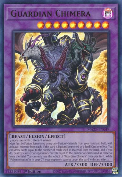 3 monsters with different namesMust first be Fusion Summoned using only Fusion Materials from your hand and field, with at least 1 monster from each. If this card is Fusion Summoned by a Spell Card or effect: You can draw cards equal to the number of cards used as material from the hand, and if you do, destroy cards your opponent controls equal to the number of cards used as material from the field. You can only use this effect of ‘Guardian Chimera’ once per turn. While ‘Polymerization’ is in your GY, your opponent cannot target this card with card effects.