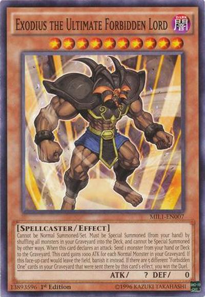 Cannot be Normal Summoned/Set. Must be Special Summoned (from your hand) by shuffling all monsters in your Graveyard into the Deck, and cannot be Special Summoned by other ways. When this card declares an attack: Send 1 monster from your hand or Deck to the Graveyard. This card gains 1000 ATK for each Normal Monster in your Graveyard. If this face-up card would leave the field, banish it instead. If there are 5 different ‘Forbidden One’ cards in your Graveyard that were sent there by this card’s effect, you win the Duel.