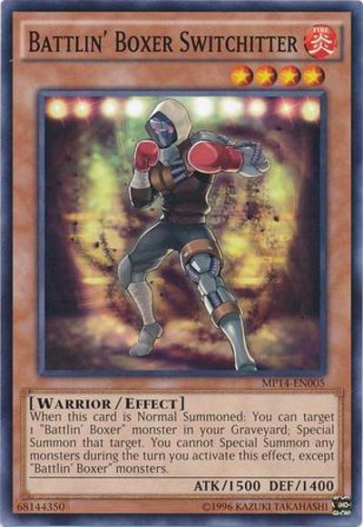 When this card is Normal Summoned: You can target 1 ‘Battlin’ Boxer’ monster in your Graveyard; Special Summon that target. You cannot Special Summon any monsters during the turn you activate this effect, except ‘Battlin’ Boxer’ monsters.