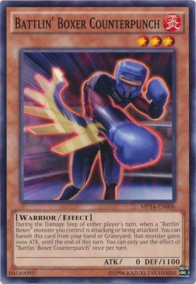 During the Damage Step of either player’s turn, when a ‘Battlin’ Boxer’ monster you control is attacking or being attacked: You can banish this card from your hand or Graveyard; that monster gains 1000 ATK, until the end of this turn. You can only use the effect of ‘Battlin’ Boxer Counterpunch’ once per turn.