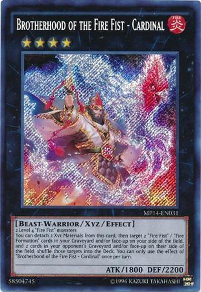 2 Level 4 ‘Fire Fist’ monstersYou can detach 2 materials from this card, then target 2 ‘Fire Fist’ / ‘Fire Formation’ cards in your GY and/or face-up field, and 2 cards in your opponent’s GY and/or face-up field; shuffle those targets into the Deck. You can only use this effect of ‘Brotherhood of the Fire Fist – Cardinal’ once per turn.