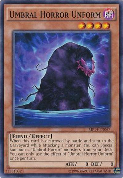 When this card is destroyed by battle and sent to the Graveyard while attacking a monster: You can Special Summon 2 ‘Umbral Horror’ monsters from your Deck. You can only use the effect of ‘Umbral Horror Unform’ once per turn.