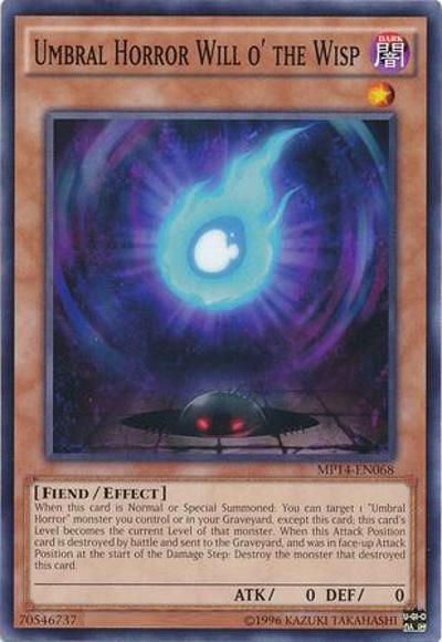 When this card is Normal or Special Summoned: You can target 1 ‘Umbral Horror’ monster you control or in your Graveyard, except this card; this card’s Level becomes the current Level of that monster. When this Attack Position card is destroyed by battle and sent to the Graveyard, and was in face-up Attack Position at the start of the Damage Step: Destroy the monster that destroyed this card.