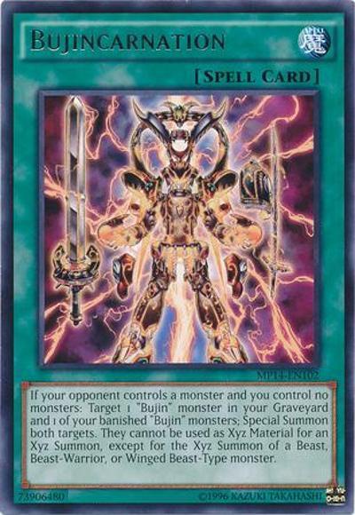 If your opponent controls a monster and you control no monsters: Target 1 ‘Bujin’ monster in your Graveyard and 1 of your banished ‘Bujin’ monsters; Special Summon both targets. They cannot be used as Xyz Material for an Xyz Summon, except for the Xyz Summon of a Beast, Beast-Warrior, or Winged Beast-Type monster.