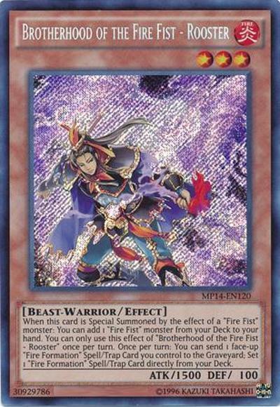 When this card is Special Summoned by the effect of a ‘Fire Fist’ monster: You can add 1 ‘Fire Fist’ monster from your Deck to your hand. You can only use this effect of ‘Brotherhood of the Fire Fist – Rooster’ once per turn. Once per turn: You can send 1 face-up ‘Fire Formation’ Spell/Trap you control to the GY; Set 1 ‘Fire Formation’ Spell/Trap directly from your Deck.