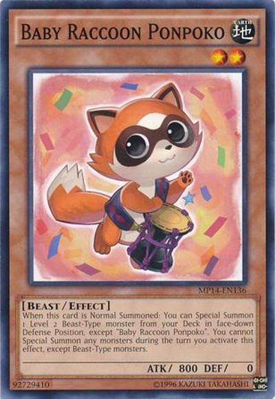 When this card is Normal Summoned: You can Special Summon 1 Level 2 Beast-Type monster from your Deck in face-down Defense Position, except ‘Baby Raccoon Ponpoko’. You cannot Special Summon any monsters during the turn you activate this effect, except Beast-Type monsters.