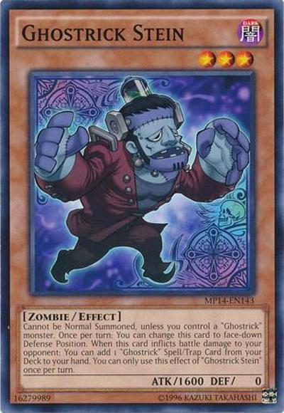 Cannot be Normal Summoned, unless you control a ‘Ghostrick’ monster. Once per turn: You can change this card to face-down Defense Position. When this card inflicts battle damage to your opponent: You can add 1 ‘Ghostrick’ Spell/Trap Card from your Deck to your hand. You can only use this effect of ‘Ghostrick Stein’ once per turn.