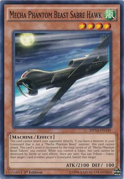 This card cannot attack your opponent directly. If you have a monster in your Graveyard that is not a ‘Mecha Phantom Beast’ monster, this card cannot attack. This card’s Level is increased by the total Levels of all ‘Mecha Phantom Beast Tokens’ you control. While you control a Token, this card cannot be destroyed by battle or card effects. Once per turn: You can Tribute 1 Token, then target 1 card in either player’s Graveyard; banish that target.