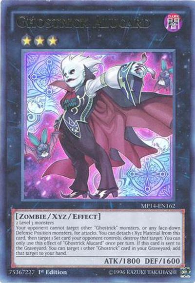 2 Level 3 monstersMonsters your opponent controls cannot target face-up ‘Ghostrick’ monsters, or any face-down Defense Position monsters, for attacks, except this one. You can detach 1 Xyz Material from this card, then target 1 Set card your opponent controls; destroy that target. You can only use this effect of ‘Ghostrick Alucard’ once per turn. If this card is sent to the Graveyard: You can target 1 other ‘Ghostrick’ card in your Graveyard; add that target to your hand.