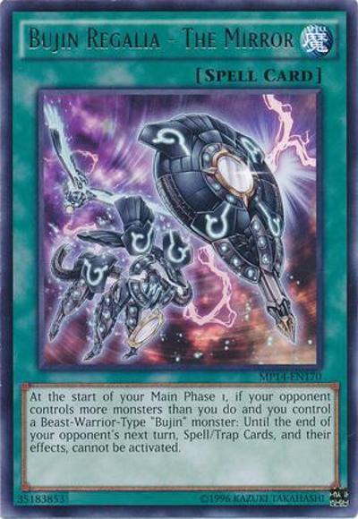At the start of your Main Phase 1, if your opponent controls more monsters than you do and you control a Beast-Warrior-Type ‘Bujin’ monster: Until the end of your opponent’s next turn, Spell/Trap Cards, and their effects, cannot be activated.