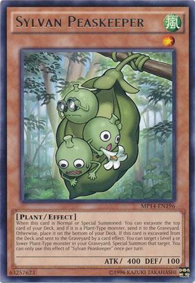 When this card is Normal or Special Summoned: You can excavate the top card of your Deck, and if it is a Plant-Type monster, send it to the Graveyard. Otherwise, place it on the bottom of your Deck. If this card is excavated from the Deck and sent to the Graveyard by a card effect: You can target 1 Level 4 or lower Plant-Type monster in your Graveyard; Special Summon that target. You can only use this effect of ‘Sylvan Peaskeeper’ once per turn.