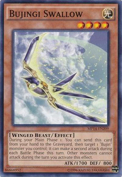 During your Main Phase 1: You can send this card from your hand to the Graveyard, then target 1 ‘Bujin’ monster you control; it can make a second attack during each Battle Phase this turn. Other monsters cannot attack during the turn you activate this effect.