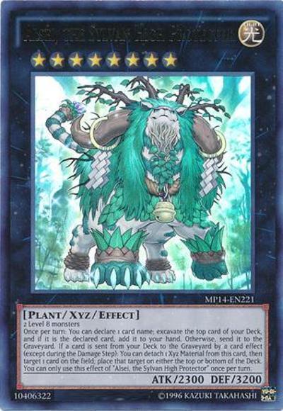 2 Level 8 monstersOnce per turn: You can declare 1 card name; excavate the top card of your Deck, and if it is the declared card, add it to your hand. Otherwise, send it to the Graveyard. If a card is sent from your Deck to the Graveyard by a card effect (except during the Damage Step): You can detach 1 Xyz Material from this card, then target 1 card on the field; place that target on either the top or bottom of the Deck. You can only use this effect of ‘Alsei, the Sylvan High Protector’ once per turn.
