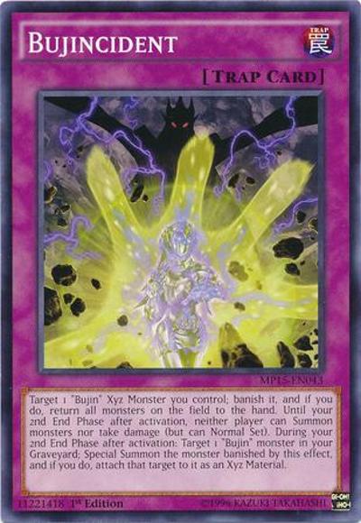 Target 1 ‘Bujin’ Xyz Monster you control; banish it, and if you do, return all monsters on the field to the hand. Until your 2nd End Phase after activation, neither player can Summon monsters nor take damage (but can Normal Set). During your 2nd End Phase after activation: Target 1 ‘Bujin’ monster in your Graveyard; Special Summon the monster banished by this effect, and if you do, attach that target to it as an Xyz Material.