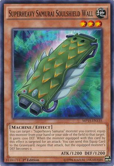 You can target 1 ‘Superheavy Samurai’ monster you control; equip this monster from your hand or your side of the field to that target. It gains 1200 DEF. When the monster equipped with this card by this effect is targeted for an attack: You can send this Equip Card to the Graveyard; negate that attack, but the equipped monster’s DEF becomes 0.