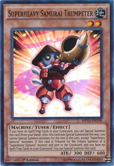 If you have no Spell/Trap Cards in your Graveyard, you can Special Summon this card (from your hand). After this card was Special Summoned this way, you cannot Special Summon monsters for the rest of this turn, except ‘Superheavy Samurai’ monsters. If this card is Tributed for the Tribute Summon of a ‘Superheavy Samurai’ monster and sent to the Graveyard, and you have no Spell/Trap Cards in your Graveyard: You can Special Summon this card.
