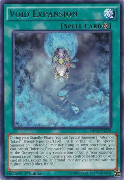 During your Standby Phase: You can Special Summon 1 ‘Infernoid Token’ (Fiend-Type/FIRE/Level 1/ATK 0/DEF 0). To Special Summon an ‘Infernoid’ monster using its own procedure, you can banish ‘Infernoid’ monster(s) you control instead of those in the Graveyard (or any combination of both). Your opponent cannot target ‘Infernoid’ monsters you control for attacks or with card effects, except the ‘Infernoid’ monster you control with the highest Level (either, if tied).