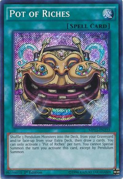 Shuffle 3 Pendulum Monsters into the Deck, from your GY and/or face-up from your Extra Deck, then draw 2 cards. You can only activate 1 ‘Pot of Riches’ per turn. You cannot Special Summon the turn you activate this card, except by Pendulum Summon.