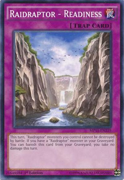 This turn, ‘Raidraptor’ monsters you control cannot be destroyed by battle. If you have a ‘Raidraptor’ monster in your Graveyard: You can banish this card from your Graveyard; you take no damage this turn.