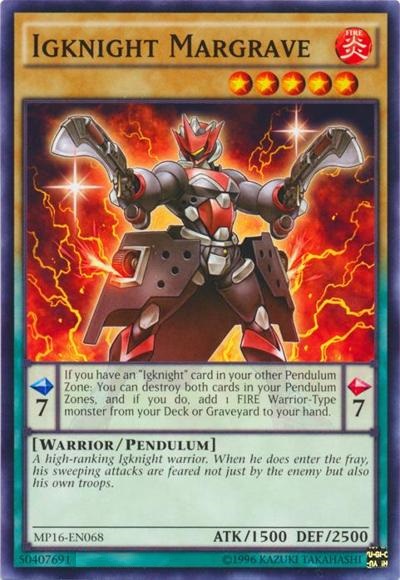 Pendulum EffectIf you have an ‘Igknight’ card in your other Pendulum Zone: You can destroy both cards in your Pendulum Zones, and if you do, add 1 FIRE Warrior-Type monster from your Deck or Graveyard to your hand.Monster EffectA high-ranking Igknight warrior. When he does enter the fray, his sweeping attacks are feared not just by the enemy but also his own troops.