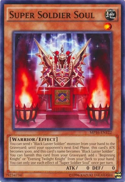 You can send 1 ‘Black Luster Soldier’ monster from your hand to the Graveyard; until your opponent’s next End Phase, this card’s ATK becomes 3000, and this card’s name becomes ‘Black Luster Soldier’. You can banish this card from your Graveyard; add 1 ‘Beginning Knight’ or ‘Evening Twilight Knight’ from your Deck to your hand. You can only use each effect of ‘Super Soldier Soul’ once per turn.