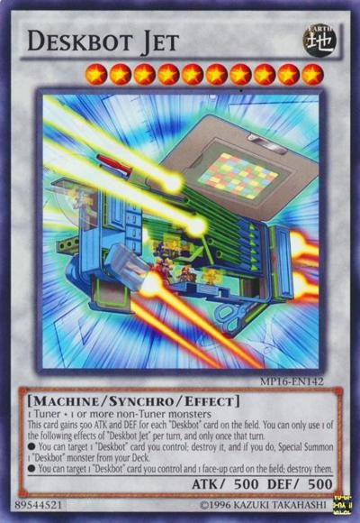 1 Tuner + 1 or more non-Tuner monstersThis card gains 500 ATK and DEF for each ‘Deskbot’ card on the field. You can only use 1 of the following effects of ‘Deskbot Jet’ per turn, and only once that turn.● You can target 1 ‘Deskbot’ card you control; destroy it, and if you do, Special Summon 1 ‘Deskbot’ monster from your Deck.● You can target 1 ‘Deskbot’ card you control and 1 face-up card on the field; destroy them.