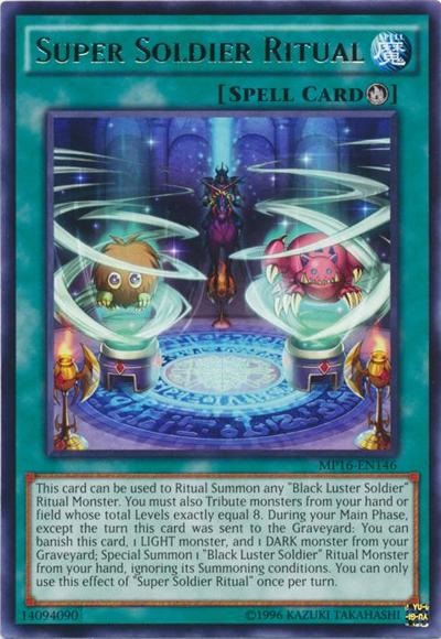This card can be used to Ritual Summon any ‘Black Luster Soldier’ Ritual Monster. You must also Tribute monsters from your hand or field whose total Levels exactly equal 8. During your Main Phase, except the turn this card was sent to the Graveyard: You can banish this card, 1 LIGHT monster, and 1 DARK monster from your Graveyard; Special Summon 1 ‘Black Luster Soldier’ Ritual Monster from your hand, ignoring its Summoning conditions. You can only use this effect of ‘Super Soldier Ritual’ once per turn.