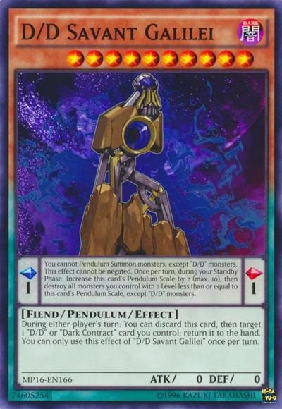Pendulum EffectYou cannot Pendulum Summon monsters, except ‘D/D’ monsters. This effect cannot be negated. Once per turn, during your Standby Phase: Increase this card’s Pendulum Scale by 2 (max. 10), then destroy all monsters you control with a Level less than or equal to this card’s Pendulum Scale, except ‘D/D’ monsters.Monster EffectDuring either player’s turn: You can discard this card, then target 1 ‘D/D’ or ‘Dark Contract’ card you control; return it to the hand. You can only use this effect of ‘D/D Savant Galilei’ once per turn.
