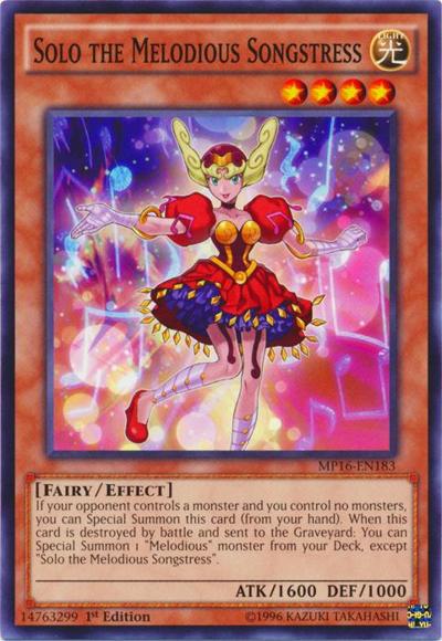 If your opponent controls a monster and you control no monsters, you can Special Summon this card (from your hand). When this card is destroyed by battle and sent to the Graveyard: You can Special Summon 1 ‘Melodious’ monster from your Deck, except ‘Solo the Melodious Songstress’.