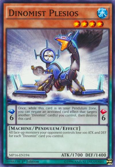 Pendulum EffectOnce, while this card is in your Pendulum Zone, you can negate an activated card effect that targets another ‘Dinomist’ card(s) you control, then destroy this card.Monster EffectAll face-up monsters your opponent controls lose 100 ATK and DEF for each ‘Dinomist’ card you control.
