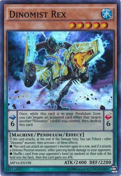 Pendulum EffectOnce, while this card is in your Pendulum Zone, you can negate an activated card effect that targets another ‘Dinomist’ card(s) you control, then destroy this card.Monster EffectIf this card attacks, at the end of the Damage Step: You can Tribute 1 other ‘Dinomist’ monster, then activate 1 of these effects;● This card can attack an opponent’s monster again in a row, and if it attacks a Defense Position monster, inflict piercing battle damage to your opponent.● Shuffle 1 card from your opponent’s hand (at random) or their side of the field into the Deck, then this card gains 100 ATK.