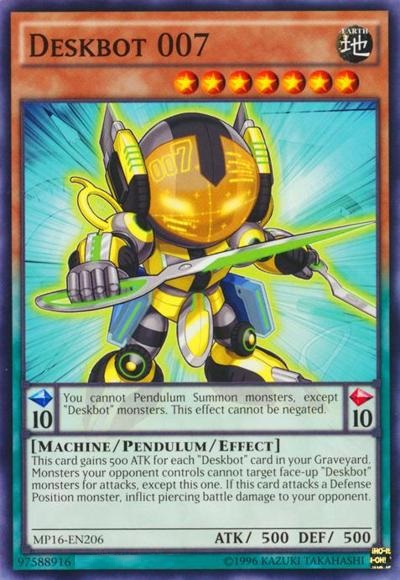Pendulum EffectYou cannot Pendulum Summon monsters, except ‘Deskbot’ monsters. This effect cannot be negated.Monster EffectThis card gains 500 ATK for each ‘Deskbot’ card in your Graveyard. Monsters your opponent controls cannot target face-up ‘Deskbot’ monsters for attacks, except this one. If this card attacks a Defense Position monster, inflict piercing battle damage to your opponent.