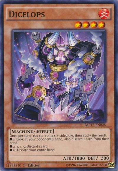 Once per turn: You can roll a six-sided die, then apply the result.● 1: Look at your opponent’s hand, also discard 1 card from their hand.● 2, 3, 4, 5: Discard 1 card.● 6: Discard your entire hand.