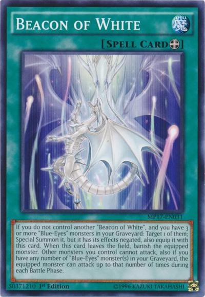 If you do not control another ‘Beacon of White’, and you have 3 or more ‘Blue-Eyes’ monsters in your GY: Target 1 of them; Special Summon it, but it has its effects negated, also equip it with this card. When this card leaves the field, banish the equipped monster. Other monsters you control cannot attack, also if you have any number of ‘Blue-Eyes’ monster(s) in your GY, the equipped monster can attack up to that number of times during each Battle Phase.