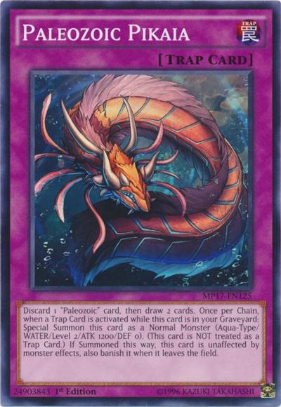 Discard 1 ‘Paleozoic’ card, then draw 2 cards. Once per Chain, when a Trap Card is activated while this card is in your Graveyard: Special Summon this card as a Normal Monster (Aqua-Type/WATER/Level 2/ATK 1200/DEF 0). (This card is NOT treated as a Trap Card.) If Summoned this way, this card is unaffected by monster effects, also banish it when it leaves the field.